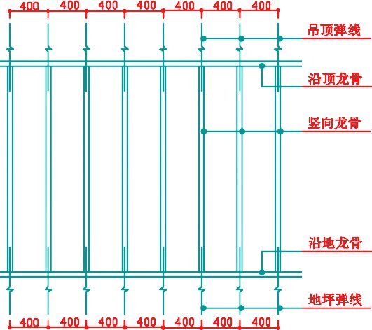 安裝豎向龍骨應垂直,龍骨間距應按設計要求布置。設計無要求時,其間距可按板寬確定,如板寬為 900mm、1200mm 時,其間距分別為 453mm、603mm。