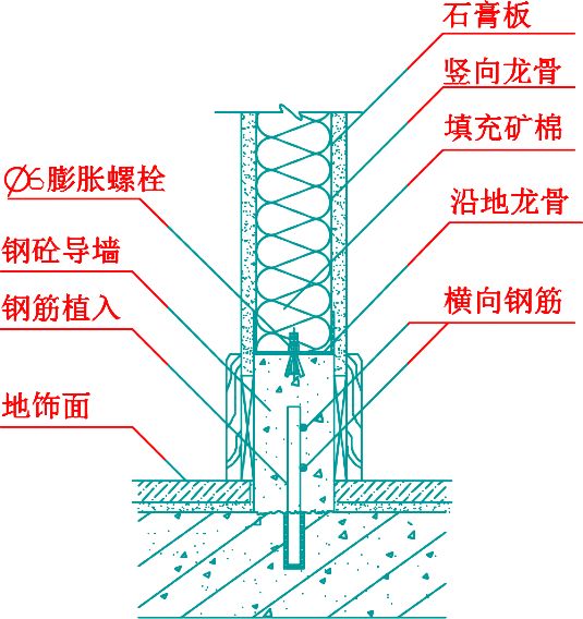 地上、兩端墻上彈線?確定墻體位置、門洞位置?安裝沿地、沿頂龍骨?安裝豎龍骨?安裝貫通龍骨幾支撐?門窗接點和特殊接點處理?石膏板安裝