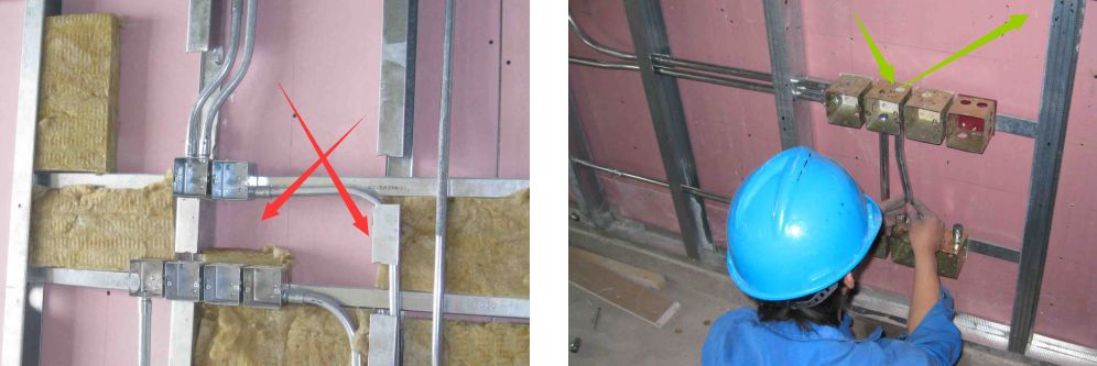 按圖紙要求預埋管道和附墻設備。要求與龍骨的安裝同步進行,或在另一面石膏板封板前進行,并采取局部加強措施,固定牢固。電氣設備專業 在墻中鋪設管線時,應避免切斷橫、豎向龍骨,同時避免在沿墻下端設置管線。